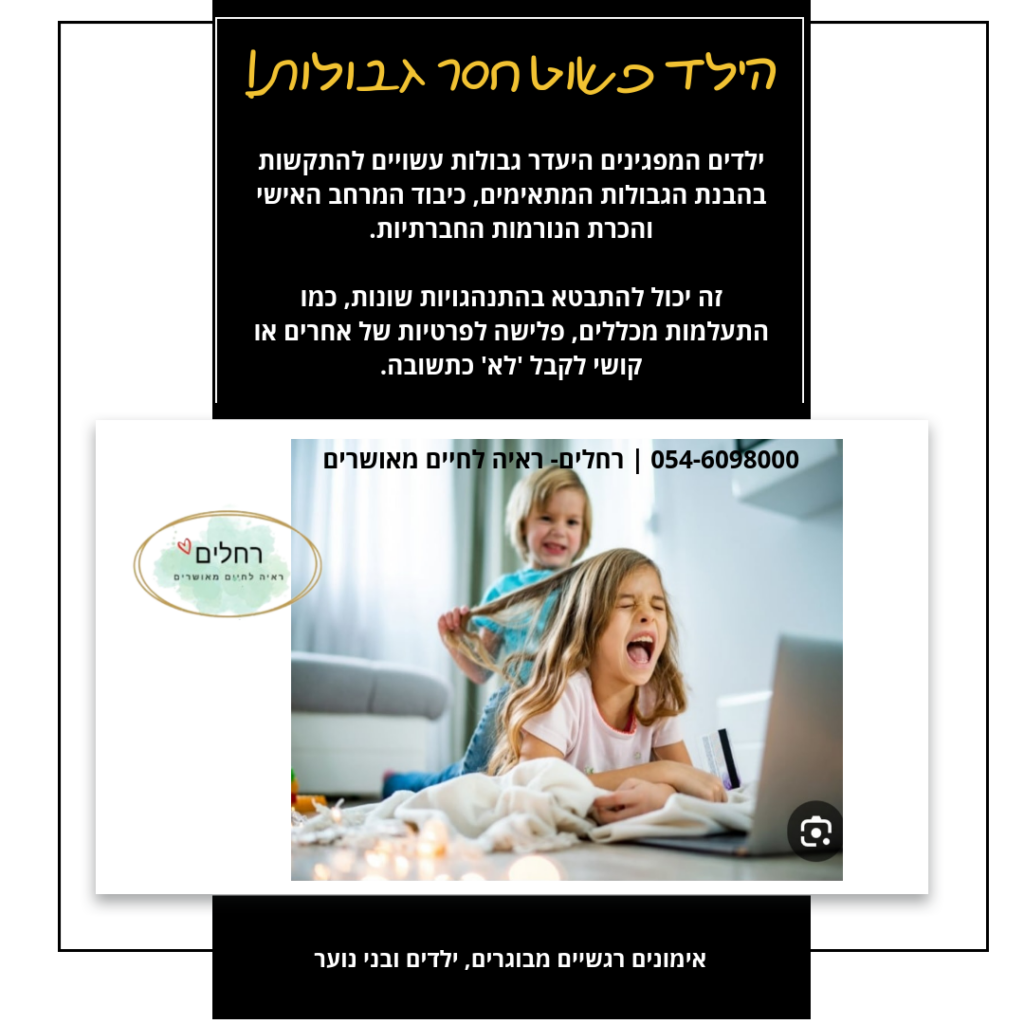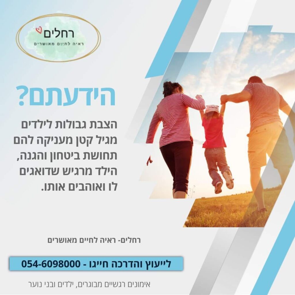 "רחלים- ראיה לחיים מאושרים מזמינה אתכם לגלות את היתרונות שבהצבת גבולות לילדים. גבולות מסייעים לילדים להתפתח בצורה נכונה ובטוחה, מאפשרים להם להבין את העולם סביבם ומאפשרים להם לפתח יכולות חברתיות ורגשיות. הצבת גבולות מסייעת לילדים להפוך לאנשים בטוחים ומאושרים. הצטרפו אלי וגלו יתרונות בהצבת גבולות לילדים!" ענת