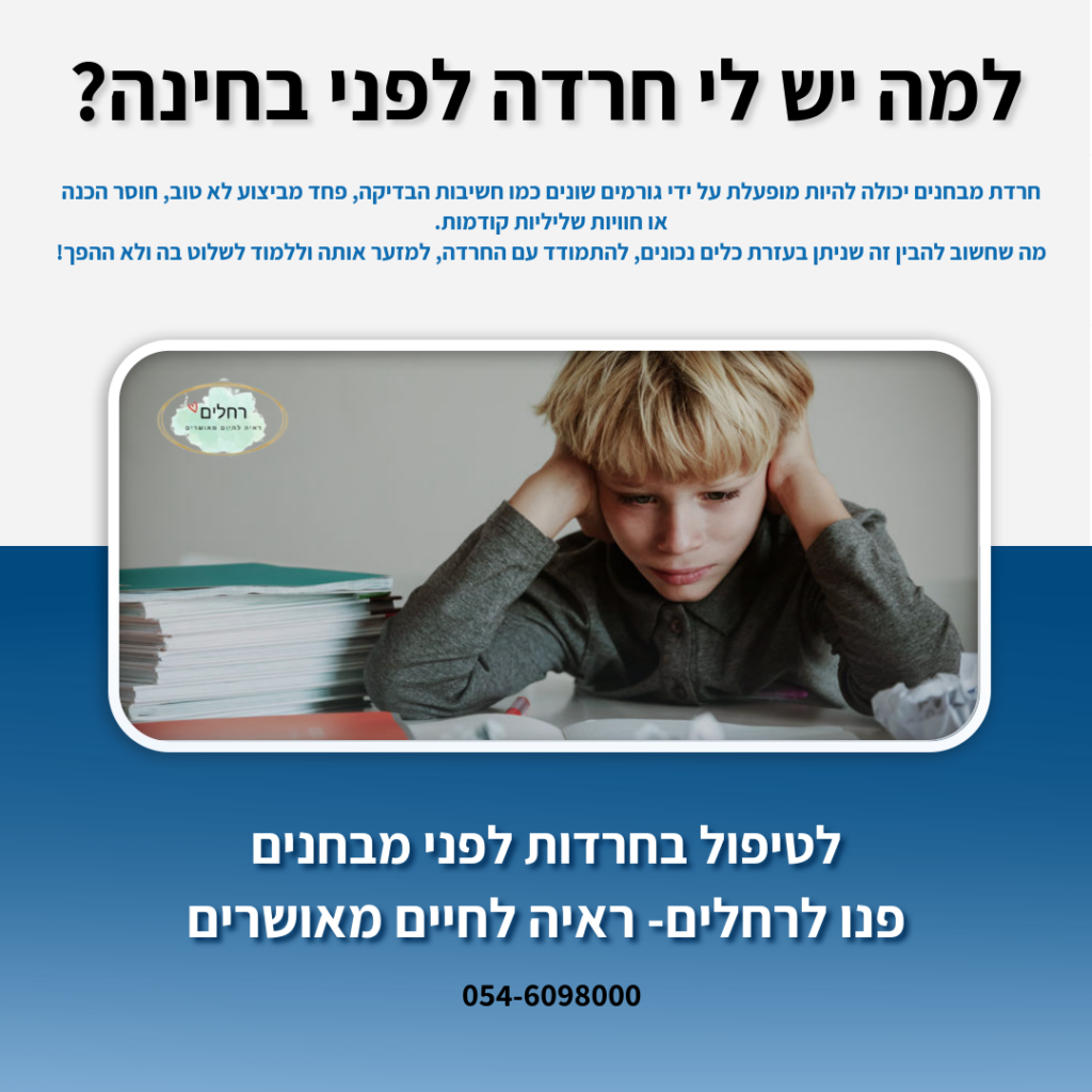 מה עושה אתכם להרגיש חרדה לפני בחינה? האם גם אתם מתמודדים עם תחושת חרדה ולחץ לפני ימי הבחינות? ברחלים- ראיה לחיים מאושרים מאמינים יש לנו את הכליים הנכונים כדי לעזור לך להתמודד עם תחושת החרדה הזו ולהתגבר עליה. בואו נלמד יחד כיצד להתמודד עם תחושת החרדה ולהתגבר עליה בקלות ובביטחון. צפו במאמר שלנו ותגלו כיצד ניתן להפוך את ימי הבחינות לחוויה חיובית ומהנה!