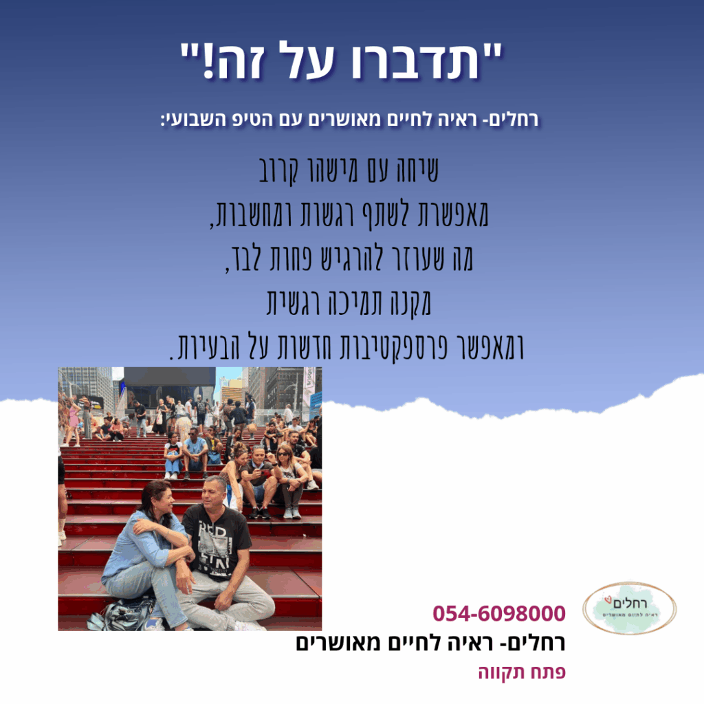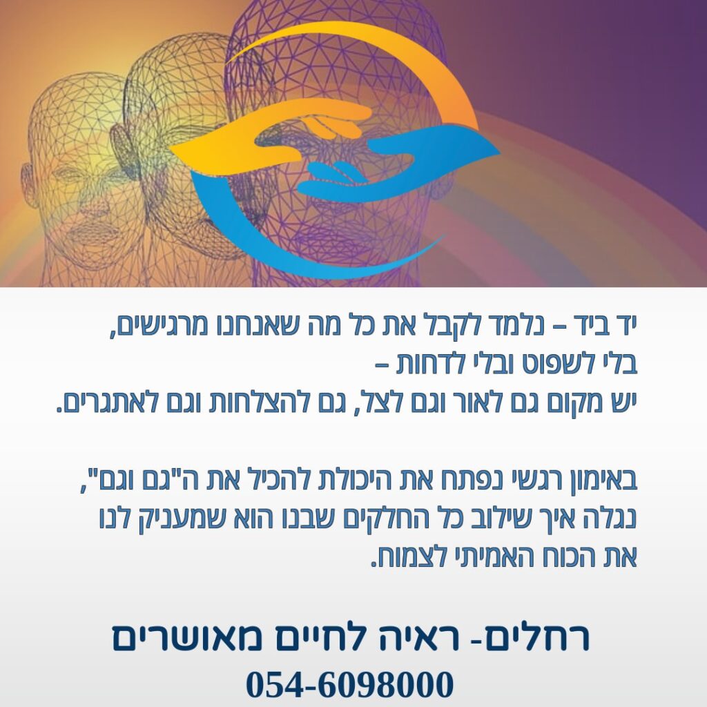 ✋ עצור רגע! כמה פעמים נתת מעצמך עד שכבר לא נשאר לך? כמה פעמים אמרת “כן” כשבתכל'ס בפנים רצית לצעוק “לא”? אנחנו נולדים עם צורך טבעי לתת. נתינה אמיתית ממלאת אותנו - היא יוצרת תחושת ערך, סיפוק, אהבה. אבל יש קו דק בין נתינה בריאה לריצוי. כשאנחנו נותנים ממקום של בחירה - אנחנו באמת מקבלים. לא כסף, לא מתנה - אלא משהו הרבה יותר עמוק: שלווה, גאווה, תחושת משמעות 🌿 אבל כשהנתינה באה על חשבון עצמנו, כשהיא נובעת מפחד - לא לאכזב, לא להישאר לבד, לא להרגיש אשמים - היא כבר לא נתינה. היא ריצוי. ובמקום למלא אותנו – היא מרוקנת. ✨ האימון הרגשי עוזר לזהות את הקו הזה בדיוק. להבין איפה אני נותנת מאהבה, ואיפה אני פשוט מנסה לרצות. וללמוד איך לבחור בעצמי - בלי להרגיש אשמה. כי נתינה אמיתית יכולה להתקיים רק כשגם אני חלק ממנה 💫 ענת רובלביץ מאמנת רגשית | NLP Master Practitioner מומחית בעבודה עם נשים, גברים, ילדים, בני נוער והורים 📞 054-6098000 רחלים – ראיה לחיים מאושרים