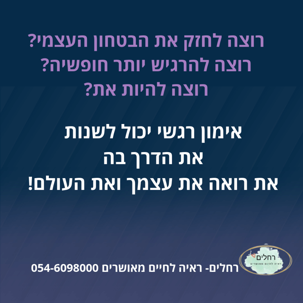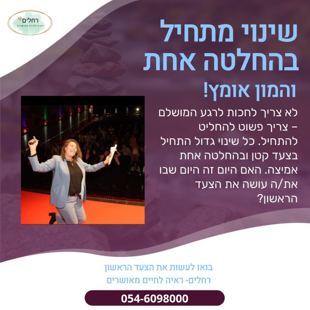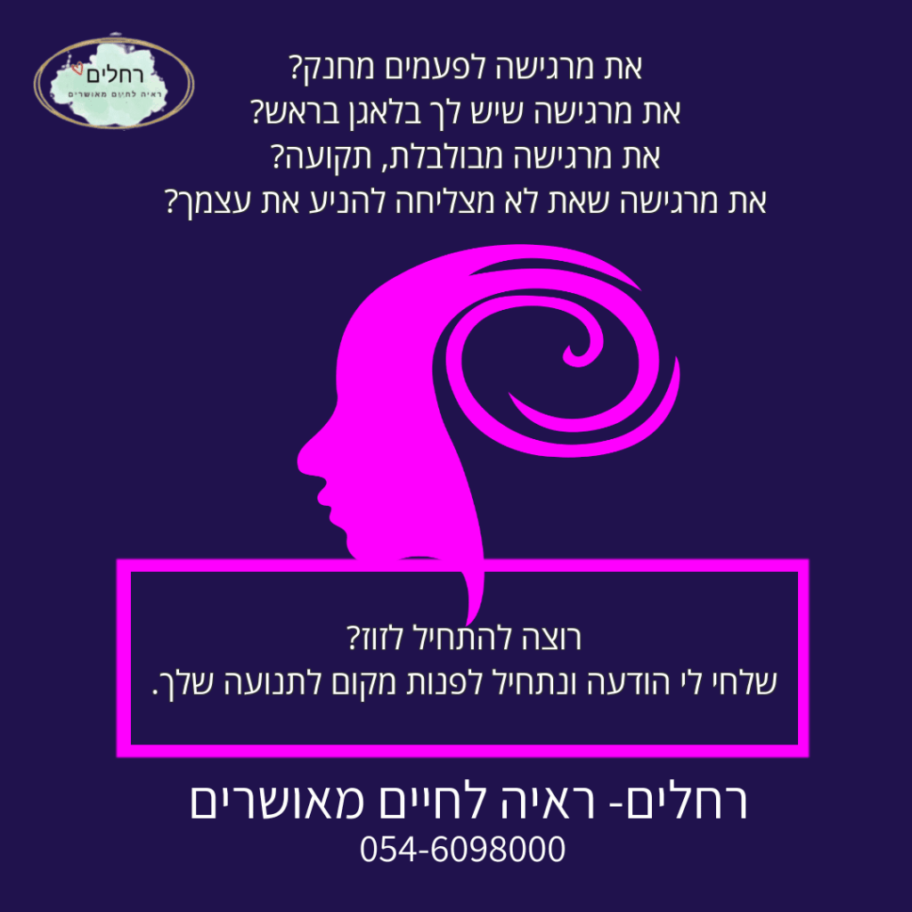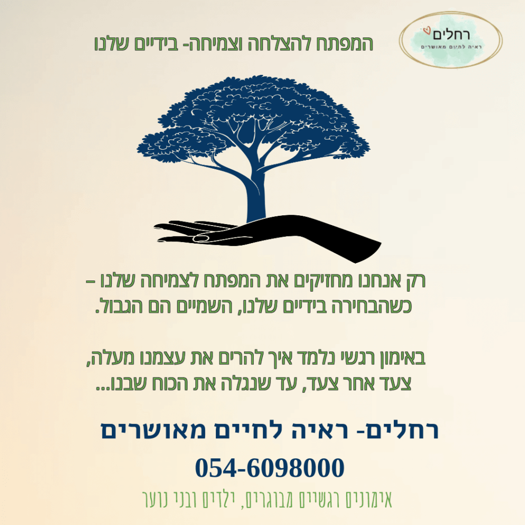 חפשת דרך להתחבר לעצמך מחדש? הגעת למקום הנכון! רחלים- ראיה לחיים מאושרים מזמינה אותך לגלות את הכוח שבתוכך וליצור שינוי אמיתי בחייך. בואו נשתף ביחד במסע האישי שלך ונמצא את האושר שממתין לך. נשמח ללוותך בדרך!
