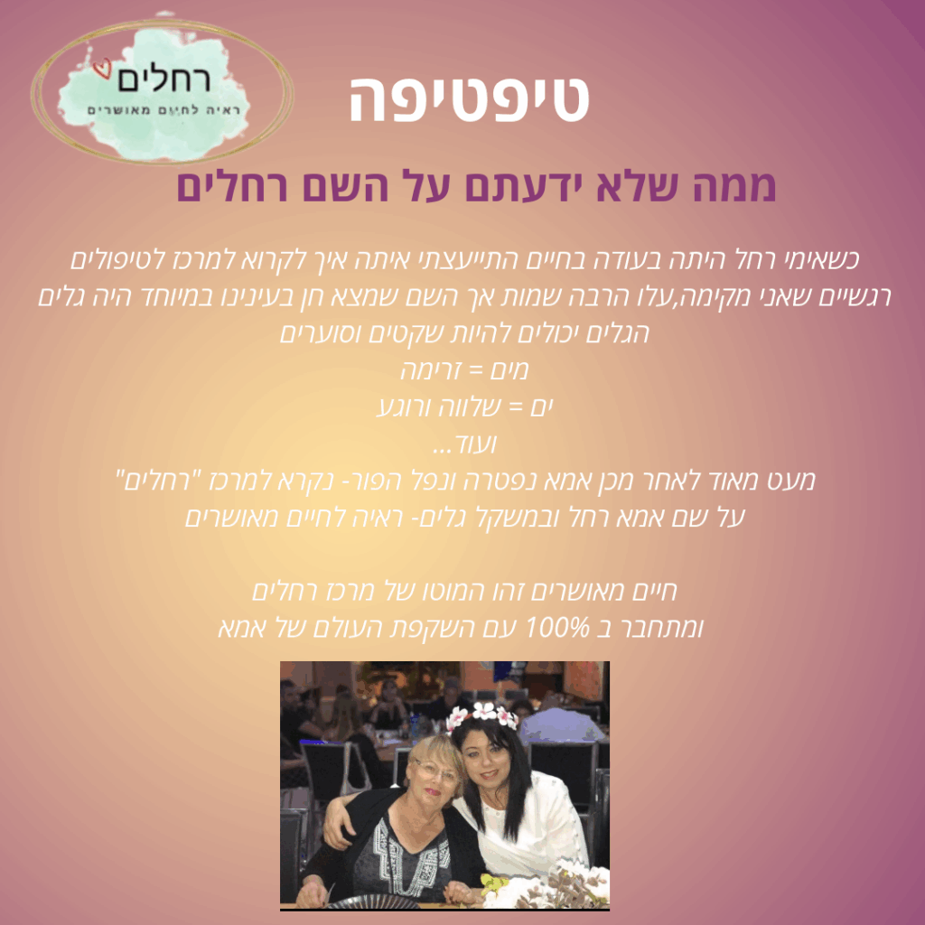 "האם אתם מחפשים דרך לחזק את הקשר המיוחד בין ההורים לילדים שלכם? ברוכים הבאים לרחלים- ראיה לחיים מאושרים! במרכזנו, אנו מאמינים בחשיבות של יצירת קשר אמיתי ואהבה בין ההורים לילדים. הצטרפו אלינו וגלו דרכים חדשות ומרתקות לחזק את הקשר המיוחד הזה וליצור חיים מאושרים ומשמעותיים יותר יחד. בואו להתחבר ולהתעניין יחד עם ילדיכם, כי רק כך ניתן לראות את העולם בעיניים שלהם. נשמח לראותכם אצלנו!"