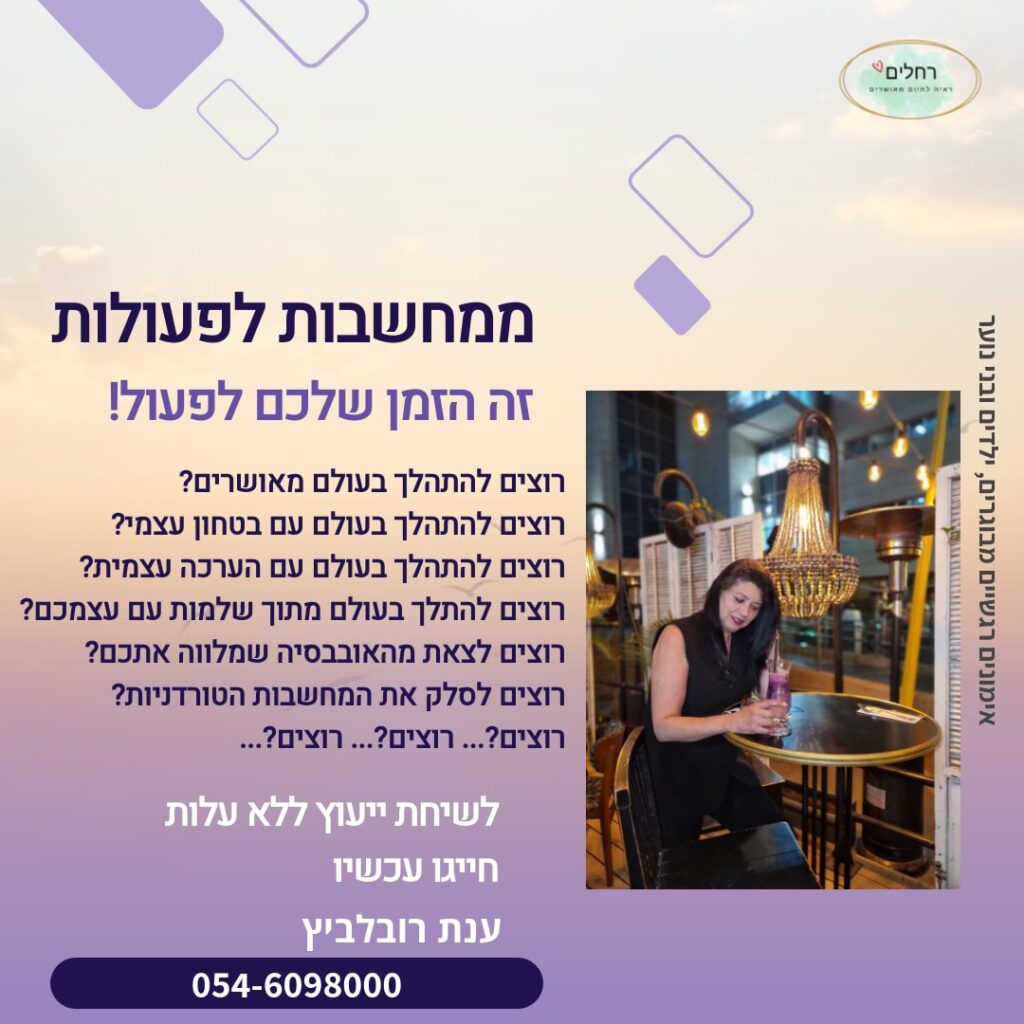 ✋ עצור רגע! חשבת פעם למה נועד התת־מודע שלך? מה הוא אוגר בתוכו? ומה באמת המטרה שלו? התת־מודע שלנו הוא כמו ארכיון ענק שמאחסן את כל הזיכרונות, החוויות, הפחדים והאמונות שלנו, גם את אלה שאנחנו בכלל לא מודעים אליהם. אבל הוא לא אויב. להפך. המטרה שלו היא להגן עלינו — לשמור שלא ניפגע שוב, שלא ניכשל, שלא נרגיש את אותו כאב ישן. הבעיה? לפעמים אותה הגנה יוצרת חסימה. אנחנו רוצים להתקדם — והוא לוחש לנו “תישאר במקום הבטוח”. אנחנו חולמים על שינוי — והוא מזכיר לנו את כל הפעמים שנכשלנו. וזה בדיוק המקום שבו אימון רגשי בשיטת NLP נכנס לתמונה 🌸 ביחד נזהה את האמונות שהצטברו שם נבין על מה הן מנסות להגן ונלמד איך לתכנת מחדש את התת־מודע כך שיעבוד בשבילנו ולא נגדנו. ✨ זה לא קסם. זו הבנה. זו בחירה. זה תהליך. וכשמתחילים להתהלך בתוך התהליך הזה, דברים פשוט מתחילים לזוז. נעים מאוד- אני ענת רובלביץ, מאמנת רגשית ומאסטר NLP מלווה נשים וגברים שבוחרים להבין את עצמם מחדש וליצור שינוי מבפנים החוצה 📞 054-6098000 רחלים - ראיה לחיים מאושרים